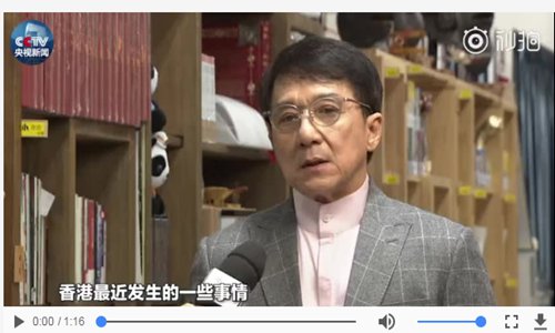 Kung fu actor Jackie Chan said he was "sad and worried" about what is going on in Hong Kong. "Hong Kong is my hometown and China is my motherland. I love them and I hope Hong Kong could return to peace as soon as possible," Chan told China Central Television on Tuesday. Photo: Screenshot of CCTV interview