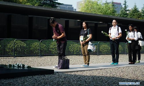 People mourn for Nanjing Massacre victims during a commemorative activity at the Memorial Hall of the Victims in Nanjing Massacre by Japanese Invaders in Nanjing, east China's Jiangsu Province, Aug. 15, 2019. A peace assembly was held Thursday in Nanjing, capital of east China's Jiangsu Province, to commemorate the 74th anniversary of Japan's surrender in World War II. A total of 20 representatives from Japan and over 140 youth representatives from ten countries including China, the Republic of Korea, the United States and the Philippines, attended the event held in the Memorial Hall of the Victims in Nanjing Massacre by Japanese Invaders, mourning the 300,000 people who were killed in one of the most barbaric episodes of World War II. (Xinhua/Ji Chunpeng)