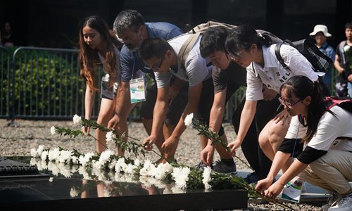 People lay flowers for Nanjing Massacre victims during a commemorative activity at the Memorial Hall of the Victims in Nanjing Massacre by Japanese Invaders in Nanjing, east China's Jiangsu Province, Aug. 15, 2019. A peace assembly was held Thursday in Nanjing, capital of east China's Jiangsu Province, to commemorate the 74th anniversary of Japan's surrender in World War II. A total of 20 representatives from Japan and over 140 youth representatives from ten countries including China, the Republic of Korea, the United States and the Philippines, attended the event held in the Memorial Hall of the Victims in Nanjing Massacre by Japanese Invaders, mourning the 300,000 people who were killed in one of the most barbaric episodes of World War II. (Xinhua/Ji Chunpeng)