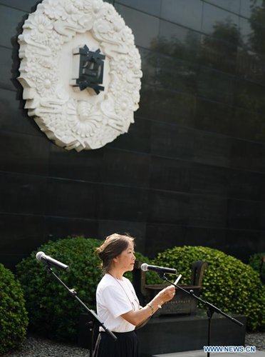 Miyauchi Yoko, head of an anti-war NGO based in Japan's Kobe, delivers a speech during a peace assembly at the Memorial Hall of the Victims in Nanjing Massacre by Japanese Invaders in Nanjing, east China's Jiangsu Province, Aug. 15, 2019. A peace assembly was held Thursday in Nanjing, capital of east China's Jiangsu Province, to commemorate the 74th anniversary of Japan's surrender in World War II. A total of 20 representatives from Japan and over 140 youth representatives from ten countries including China, the Republic of Korea, the United States and the Philippines, attended the event held in the Memorial Hall of the Victims in Nanjing Massacre by Japanese Invaders, mourning the 300,000 people who were killed in one of the most barbaric episodes of World War II. (Xinhua/Ji Chunpeng)