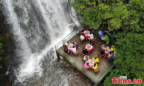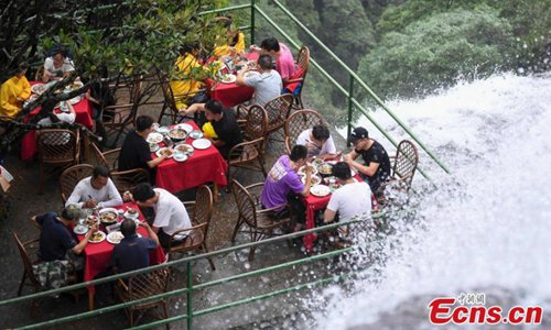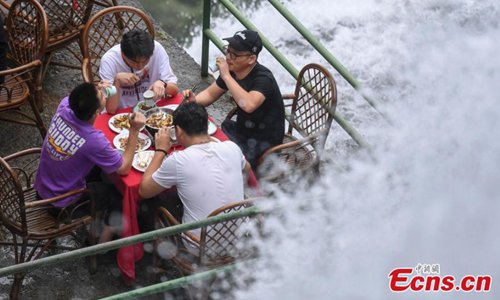 A newly opened restaurant is located beside an 80-meter-high waterfall at Longquan Mountain in Zhejiang Province, the highest peak in the Yangtze River Delta Region. Many tourists visit the destination in summer as the average temperature is only 19 degrees Celsius. (Photo: China News Service/Wang Qiwei)
