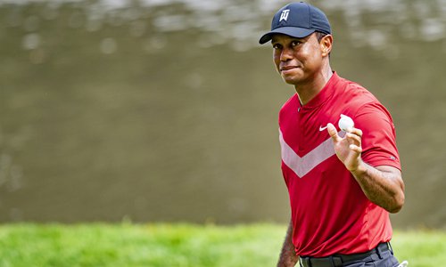 Tiger Woods reacts after sinking a putt for par on the 17th hole in the final round of the BMW Championship on Sunday in Medinah, Illinois. Photo: VCG
