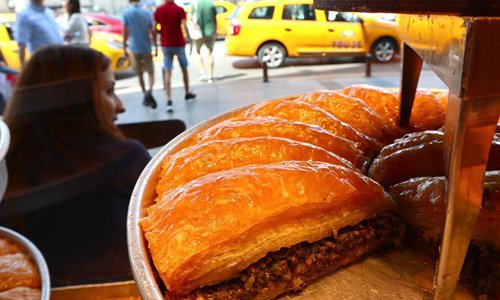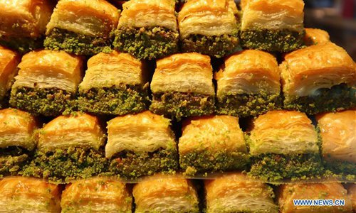 Photo taken on Aug. 18, 2019 shows the Baklava served in a bakery in Istanbul, Turkey. Baklava, prepared with fresh pistachios or walnuts and a glistening honey glaze on top of the puffed pastry, is traditionally consumed on special days, from religious festivals to celebrations. (Xinhua/Xu Suhui)