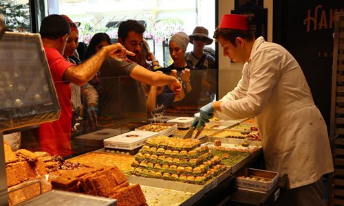 A staff member sells Baklava in a bakery in Istanbul, Turkey, Aug. 18, 2019. Baklava, prepared with fresh pistachios or walnuts and a glistening honey glaze on top of the puffed pastry, is traditionally consumed on special days, from religious festivals to celebrations. (Xinhua/Xu Suhui)