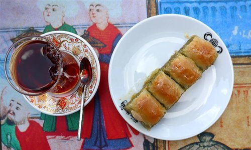 Photo taken on Aug. 18, 2019 shows the Baklava and tea served in a bakery in Istanbul, Turkey. Baklava, prepared with fresh pistachios or walnuts and a glistening honey glaze on top of the puffed pastry, is traditionally consumed on special days, from religious festivals to celebrations. (Xinhua/Xu Suhui)