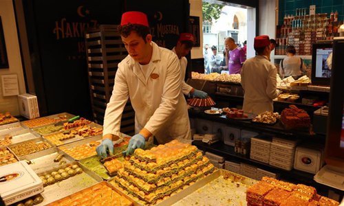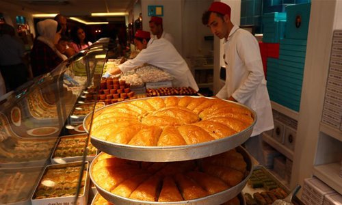 Staff members prepare Baklava in a bakery in Istanbul, Turkey, Aug. 18, 2019. Baklava, prepared with fresh pistachios or walnuts and a glistening honey glaze on top of the puffed pastry, is traditionally consumed on special days, from religious festivals to celebrations. (Xinhua/Xu Suhui)
