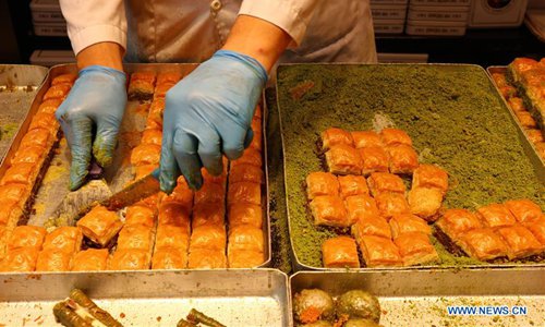 A staff member prepares Baklava in a bakery in Istanbul, Turkey, Aug. 18, 2019. Baklava, prepared with fresh pistachios or walnuts and a glistening honey glaze on top of the puffed pastry, is traditionally consumed on special days, from religious festivals to celebrations. (Xinhua/Xu Suhui)