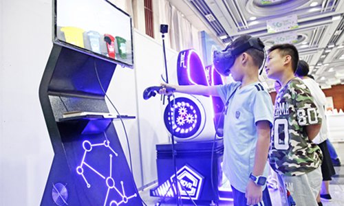 Two children play a virtual reality game about recycling trash at a science exhibition hall in Hangzhou, East China's Zhejiang Province on Tuesday. The hall invited 32 children from rural areas to learn about science and technology. Photo: VCG