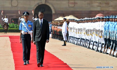 Zambia's President Edgar Chagwa Lungu reviews the guard of honour during a ceremonial reception at the Presidential Palace in New Delhi, India, Aug. 21, 2019. Lungu has arrived in India for a three-day state visit, according to a release on Tuesday. (Photo by Partha Sarkar/Xinhua)