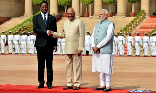 Indian President Ram Nath Kovind (C) shakes hand with his Zambian counterpart Edgar Chagwa Lungu (L) as Indian Prime Minister Narendra Modi looks on during a ceremonial reception at the Presidential Palace in New Delhi, India, Aug. 21, 2019. Lungu has arrived in India for a three-day state visit, according to a release on Tuesday. (Photo by Partha Sarkar/Xinhua)