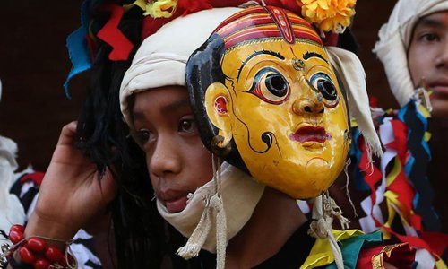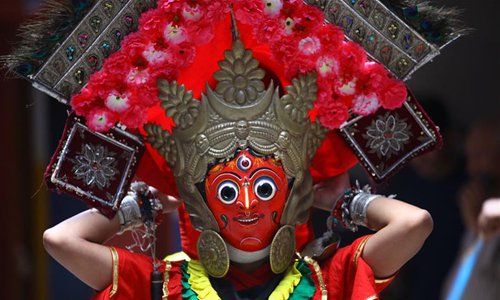 A mask dancer performs during the traditional "Bhairav Dance" in Bhaktapur, Nepal, Aug. 22, 2019. Bhairav Dance is performed on a week-long Gaijatra festival, during which people dance wearing masks to commemorate the departed family members.(Photo: Xinhua)