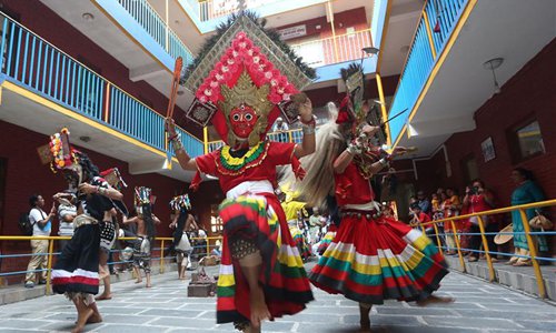 Mask dancers perform during the traditional "Bhairav Dance" in Bhaktapur, Nepal, Aug. 22, 2019. Bhairav Dance is performed on a week-long Gaijatra festival, during which people dance wearing masks to commemorate the departed family members.(Photo: Xinhua)