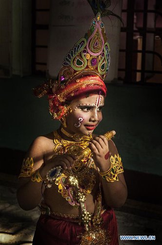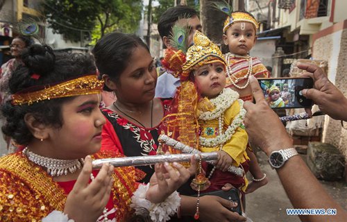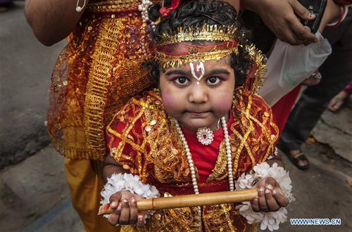 A toddler dressed as Hindu Lord Krishna takes part in Krishna Janmashtami celebrations at a temple in Kolkata, India, on Aug. 23, 2019. Krishna Janmashtami is an annual Hindu festival that celebrates the birth of Lord Krishna, the eighth avatar of Vishnu. (Photo: Xinhua)