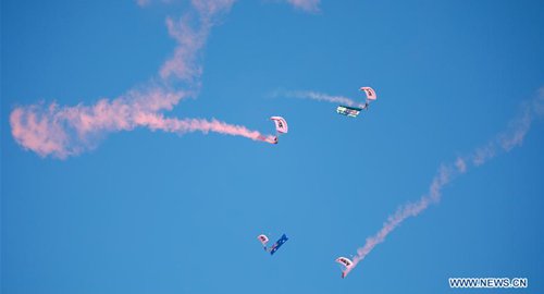 Photo taken on Aug. 24, 2019 shows a parachute display during the open day of the Australian Defence Force Academy (ADFA) in Canberra, Australia. The annual open day of the ADFA was held here on Saturday with a range of displays. (Photo: Chu Chen/Xinhua)