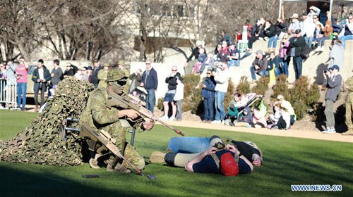 Photo taken on Aug. 24, 2019 shows a simulated ground attack during the open day of the Australian Defence Force Academy (ADFA) in Canberra, Australia. The annual open day of the ADFA was held here on Saturday with a range of displays. (Photo: Chu Chen/Xinhua)