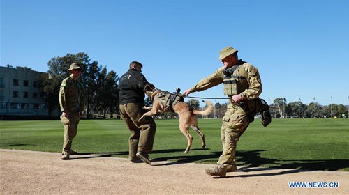 Photo taken on Aug. 24, 2019 shows an army dog display during the open day of the Australian Defence Force Academy (ADFA) in Canberra, Australia. The annual open day of the ADFA was held here on Saturday with a range of displays. (Photo: Chu Chen/Xinhua)