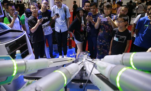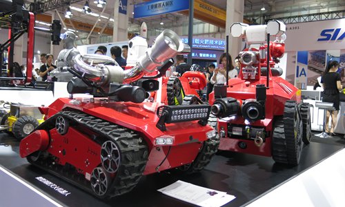 Firefighting robots from Harbin Institute of Technology Robot Group are on display at the World Robot Conference 2019 in Beijing on Wednesday. Photo: Zhang Dan/GT