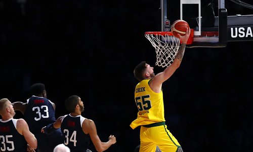 Mitch Creek of Australia drives to the basket during a game between Australia and the US at Marvel Stadium on Saturday in Melbourne, Australia. Photo: VCG