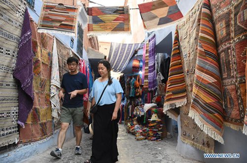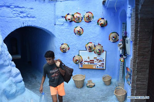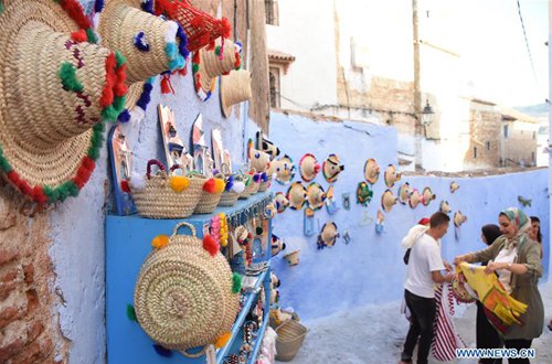Tourists visit a souvenir stand in Chefchaouen, Morocco, on Aug. 24, 2019. Chefchaouen is a tourist destination in northern Morocco, known as Morocco's "blue city" for its blue walls and alleys. (Photo: Chadi/Xinhua)