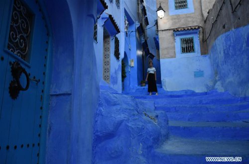 A girl is seen in an alley in Chefchaouen, Morocco, on Aug. 24, 2019. Chefchaouen is a tourist destination in northern Morocco, known as Morocco's "blue city" for its blue walls and alleys. (Photo: Xinhua)