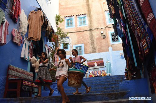 Children walk in an alley in Chefchaouen, Morocco, on Aug. 24, 2019. Chefchaouen is a tourist destination in northern Morocco, known as Morocco's "blue city" for its blue walls and alleys. (Photo: Xinhua)