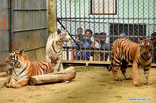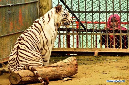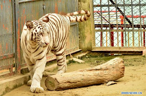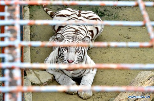 A white albino Bengal tiger (C) is seen at a zoo in Chittagong, Bangladesh, Aug. 24, 2019. It was the first white tiger born in Bangladesh. (Photo: Salim Reza/Xinhua)