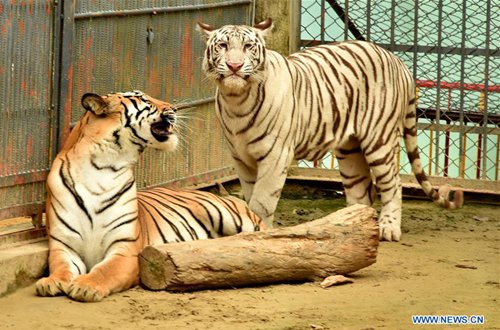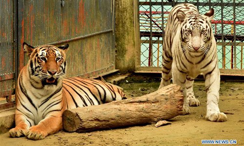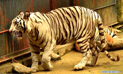 A white albino Bengal tiger (R) is seen at a zoo in Chittagong, Bangladesh, Aug. 24, 2019. It was the first white tiger born in Bangladesh. (Photo: Salim Reza/Xinhua)