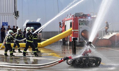 A tank-alike fire fighting robot on Tuesday sprays water during a fire drill in Beijing, which involves 65 firefighters and 13 vehicles. The robot can enter a fire site and send real-time images to the command center. Photo: IC