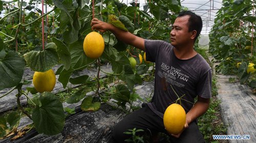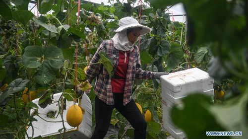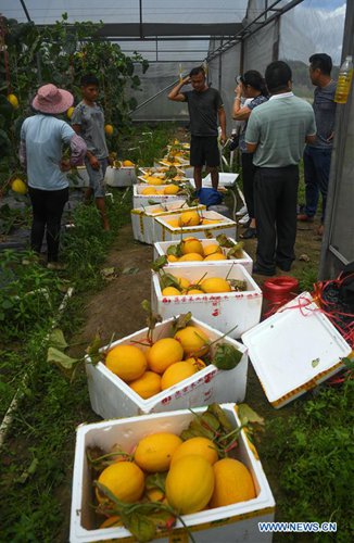 A farmer harvests muskmelons at Qingcao Village of Jiulong Township in Qinnan District of Qinzhou City, south China's Guangxi Zhuang Autonomous Region, Aug. 30, 2019. Qingcao Village has in recent years been committed to developing muskmelon planting industry through joint efforts from cooperatives and individuals, as a way to help lift impoverished households out of poverty. (Photo: Xinhua)