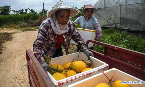 Farmers harvest muskmelons at Qingcao Village of Jiulong Township in Qinnan District of Qinzhou City, south China's Guangxi Zhuang Autonomous Region, Aug. 30, 2019. Qingcao Village has in recent years been committed to developing muskmelon planting industry through joint efforts from cooperatives and individuals, as a way to help lift impoverished households out of poverty. (Photo: Xinhua)
