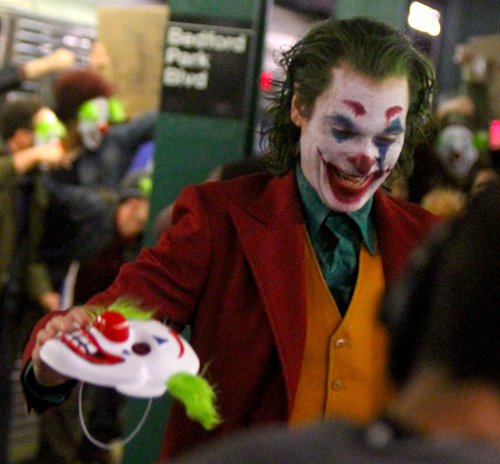 Trailers for the movie show Phoenix as a vulnerable man working as a street clown and being a victim himself, harassed and assaulted on a subway train.