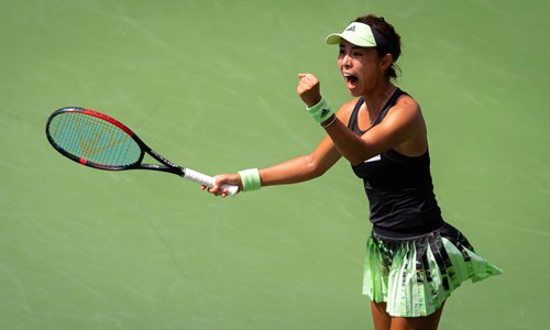 Wang Qiang celebrates a point in her match at the US Open tennis tournament against Ashleigh Barty on Sunday. Photo: IC