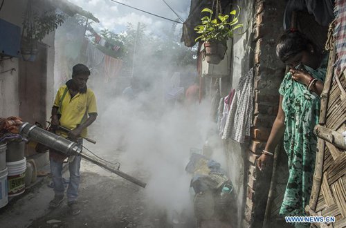 Staff members from local health department fumigate a settlement to kill mosquitoes and larvae to prevent mosquito-borne diseases in Kolkata, India, on Sep. 2, 2019. (Photo: Xinhua)