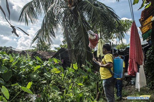 A staff member from local health department spreads pest-control chemicals to kill mosquitoes and larvae to prevent mosquito-borne diseases in Kolkata, India, on Sep. 2, 2019. (Photo: Xinhua)