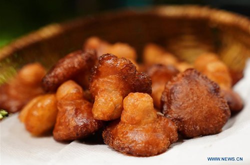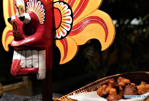 Konda Kavum, traditional dessert in Sri Lanka made with rice flour, syrup and coconut milk, are displayed at a hotel in Colombo, Sri Lanka, Sept. 2, 2019.(Photo: Xinhua)