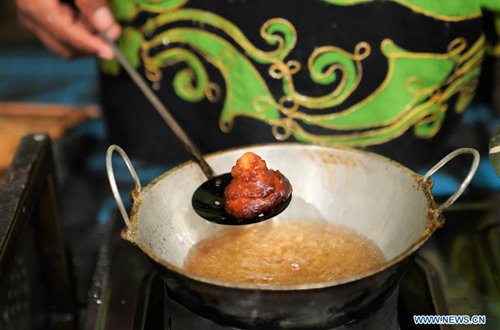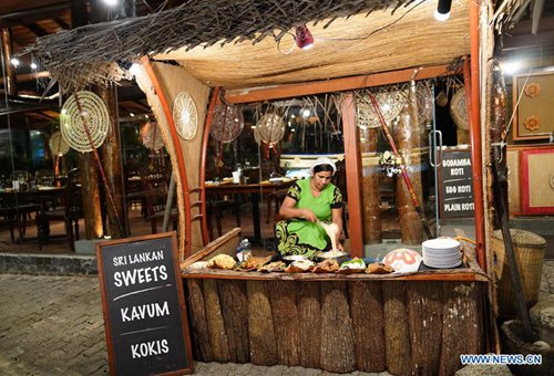 A woman makes Konda Kavum, traditional dessert in Sri Lanka made with rice flour, syrup and coconut milk, at a hotel in Colombo, Sri Lanka, Sept. 2, 2019. (Photo: Xinhua)