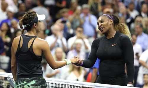 Serena Williams (right) of the US shakes hands with Wang Qiang of China at the net after their match at the US Open on Tuesday in New York City. Photo: AFP