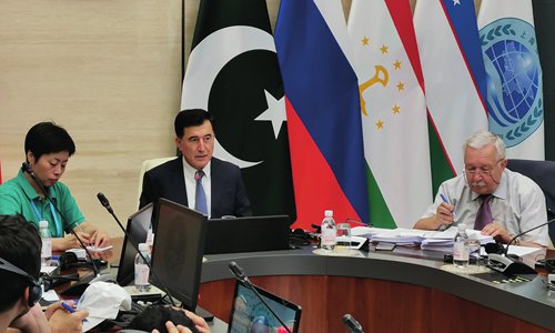 The SCO Secretary-general Vladimir Norov (center) gives remarks to the media representatives at the SCO Headquarters in Beijing. Photo: YinYeping/GT