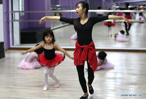 A girl is guided by a teacher at the Myanmar Ballet School in Yangon, Myanmar, Sept. 7, 2019. Myanmar ballet school has been offering ballet classes for children and adults from both home and abroad. (Photo: Xinhua)
