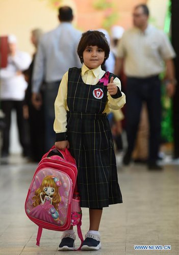 A student gestures on her way to school in Hawalli Governorate, Kuwait, on Sept. 8, 2019. Thousands of students in Kuwait returned to school on Sunday as a new school year began. (Photo: Asad/Xinhua)