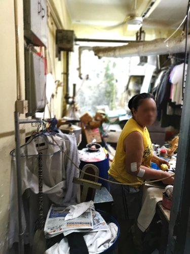 Inside a packed small room that serves as a laundry shop, a kitchen and bedroom for workers in a "Tong Lau" in the Kowloon area in Hong Kong. Photo: Wang Cong/GT