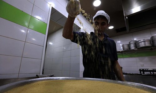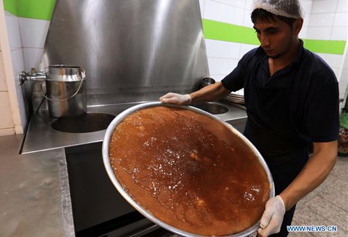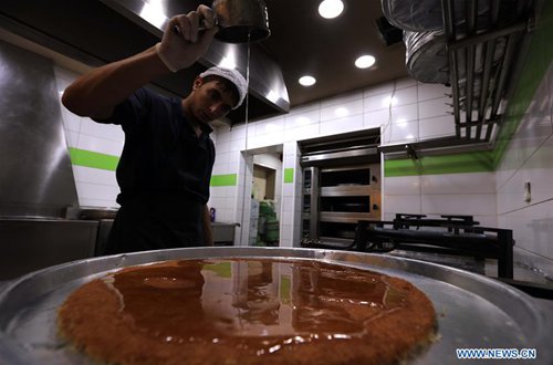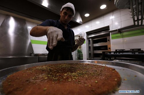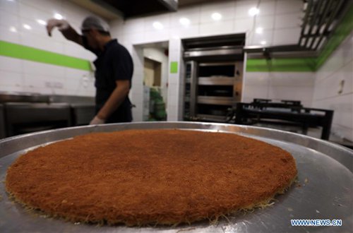 A baker makes kunafa at a store in Amman, Jordan, Sept. 8, 2019. Kunafa is a traditional Arabic dessert made of cheese, flour, syrup, and added with nuts as ingredients. (Photo: Xinhua/Mohammad Abu Ghosh)