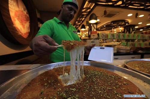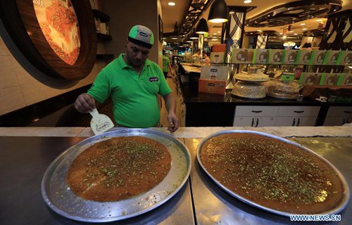 A vendor sells kunafa at a store in Amman, Jordan, Sept. 8, 2019. Kunafa is a traditional Arabic dessert made of cheese, flour, syrup, and added with nuts as ingredients. (Photo: Xinhua/Mohammad Abu Ghosh)