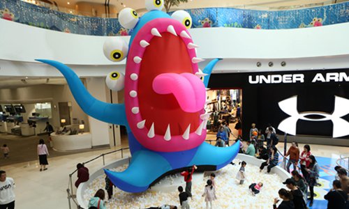 A 7-meter-tall, seven-eyed inflatable sea monster is on display at a shopping mall in East China's Shanghai Municipality until June 16. It was made by Filthy Luker and Pedro Estrella, two well-known British street artists. Photo: IC