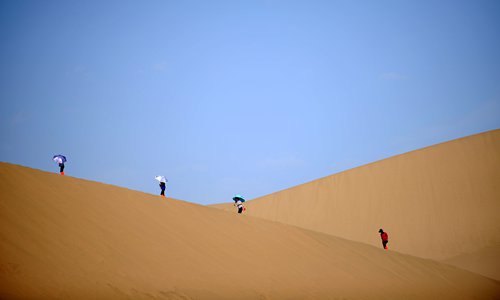 Tourists hike up Mingsha mountain, Dunhuang, Northwest China's Gansu Province, in 2012. Photo: IC