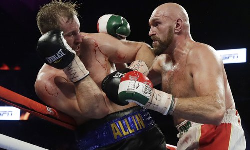 Tyson Fury (right) of England punches Otto Wallin of Sweden on Saturday in Las Vegas. Photo: IC
