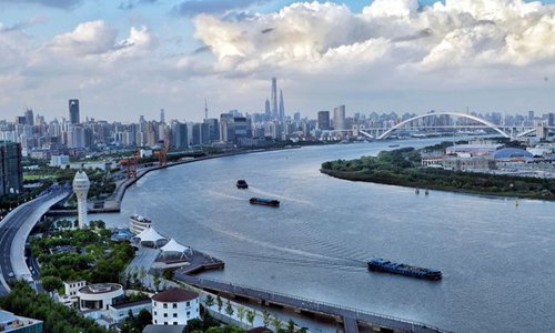 Photo shows an aerial view of one section of Huangpu River in east China's Shanghai Municipality. (Photo: Xinhua)