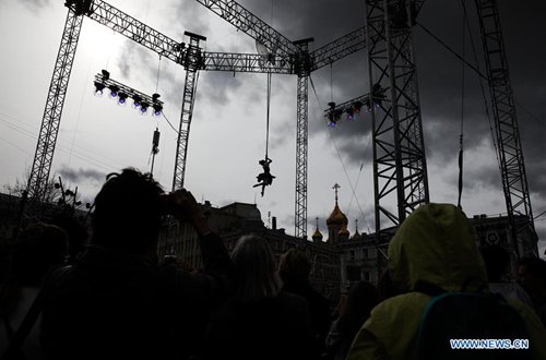 Acrobats perform during the Circus Arts Festival in Moscow, Russia, on Sept. 15, 2019. A Circus Arts Festival dedicated to the 100th anniversary of the national state circus was held over the weekend on the Boulevard Ring of Moscow. (Photo: Maxim Chernavsky/Xinhua)
