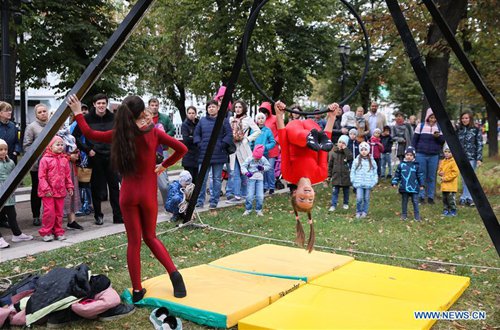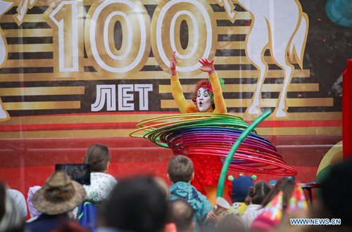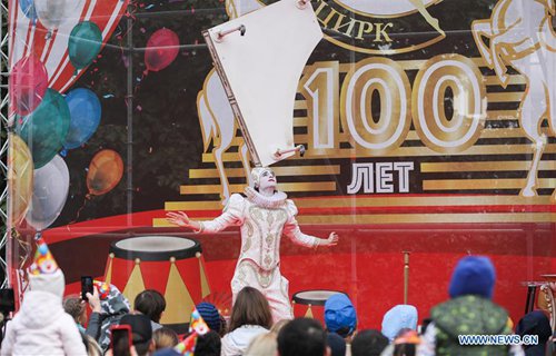 An actor performs during the Circus Arts Festival in Moscow, Russia, on Sept. 15, 2019. A Circus Arts Festival dedicated to the 100th anniversary of the national state circus was held over the weekend on the Boulevard Ring of Moscow. (Photo: Maxim Chernavsky/Xinhua)