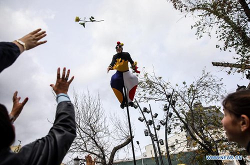 A circus actor throws flowers to visitors during the Circus Arts Festival in Moscow, Russia, on Sept. 15, 2019. A Circus Arts Festival dedicated to the 100th anniversary of the national state circus was held over the weekend on the Boulevard Ring of Moscow. (Photo: Maxim Chernavsky/Xinhua)